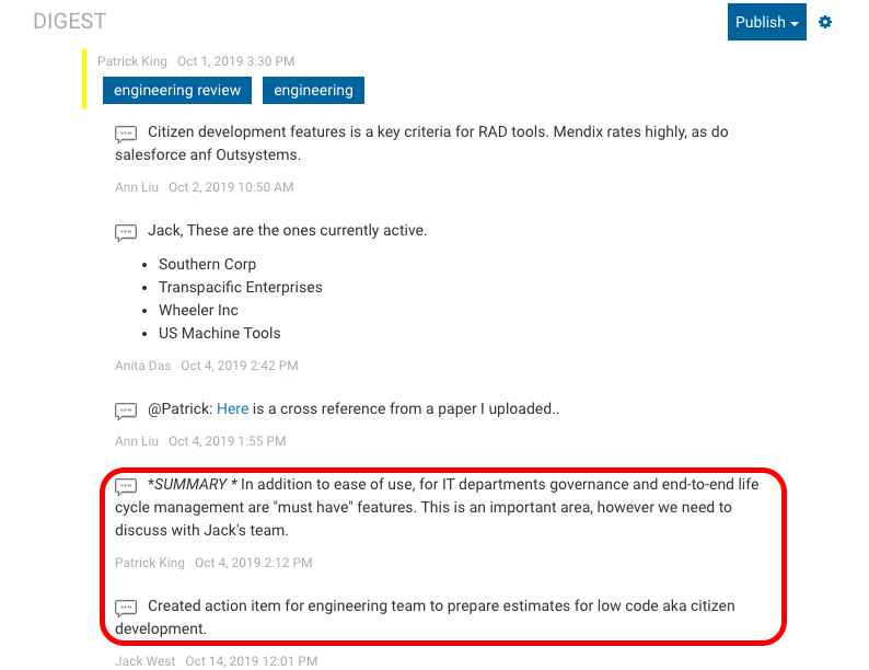 As we have seen in this use case, digests can be used as the interim documents between the core team (product and marketing managers) and executive reviewers and stakeholders. After the review and alignment phase, customized digests are used to communicate with development and marketing teams.